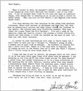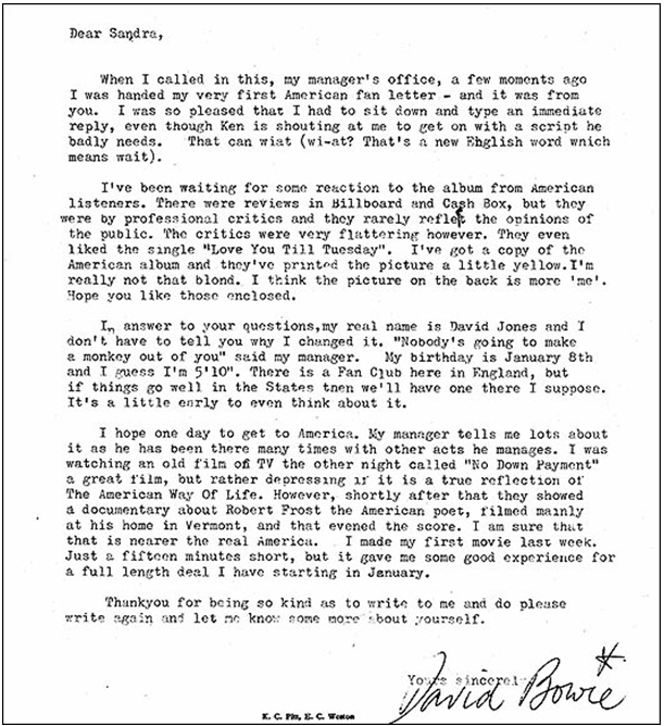 David Bowie cumple hoy 63 años. The Sun ha publicado la primera carta que escribió a un fan americano, en 1967, y que Sandra Dodd, la destinataria, ha sacado a la luz recientemente. Su lectura es fascinante… ¡cómo han cambiado los tiempos!